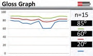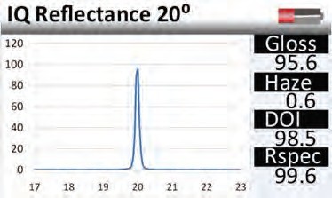 鏡向光澤度-該儀器顯示的是表面17-23°的反射面。圖中曲線的形狀描述了光和表面的相互影響。接近鏡面的曲線的急轉(zhuǎn)彎說(shuō)明了表面光滑的高反射。