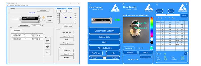 為了進一步處理您的測量數據,您可以將測量設備與移動Android和iOS設備配對。或者您與Windows PC通信。這是通過藍牙低功耗技術(BLE)實現的。使用Lima Connect應用程序,您可以管理項目并在照片上分配測量點。測量結果可以進行統計評估并以圖形方式顯示。適用于Android、iOS和Windows的應用程序是免費的。